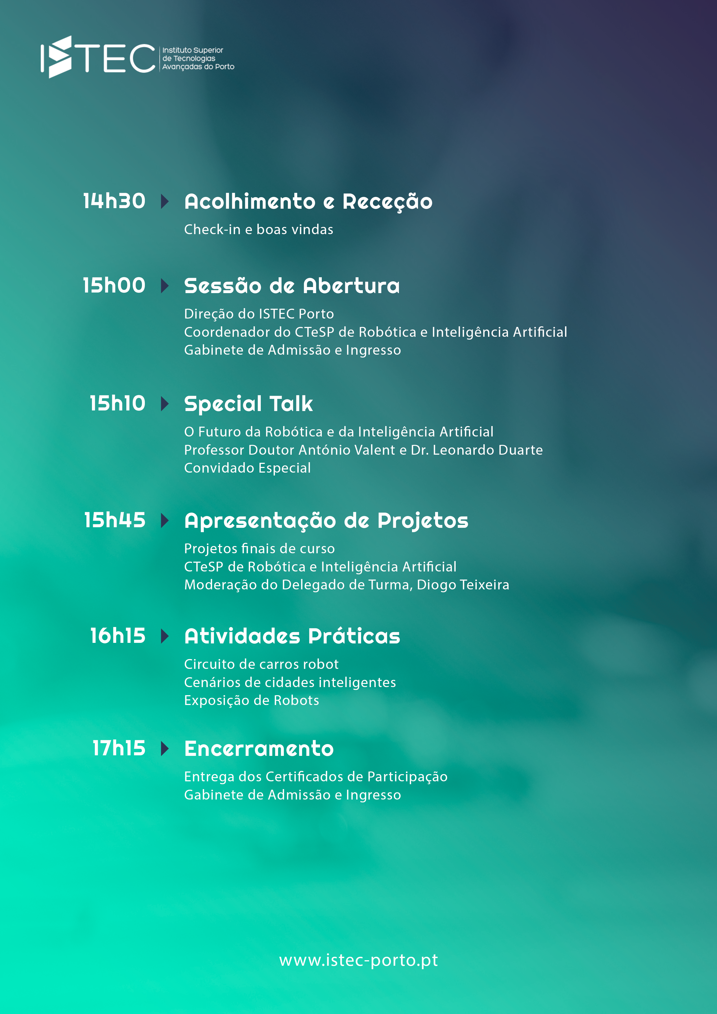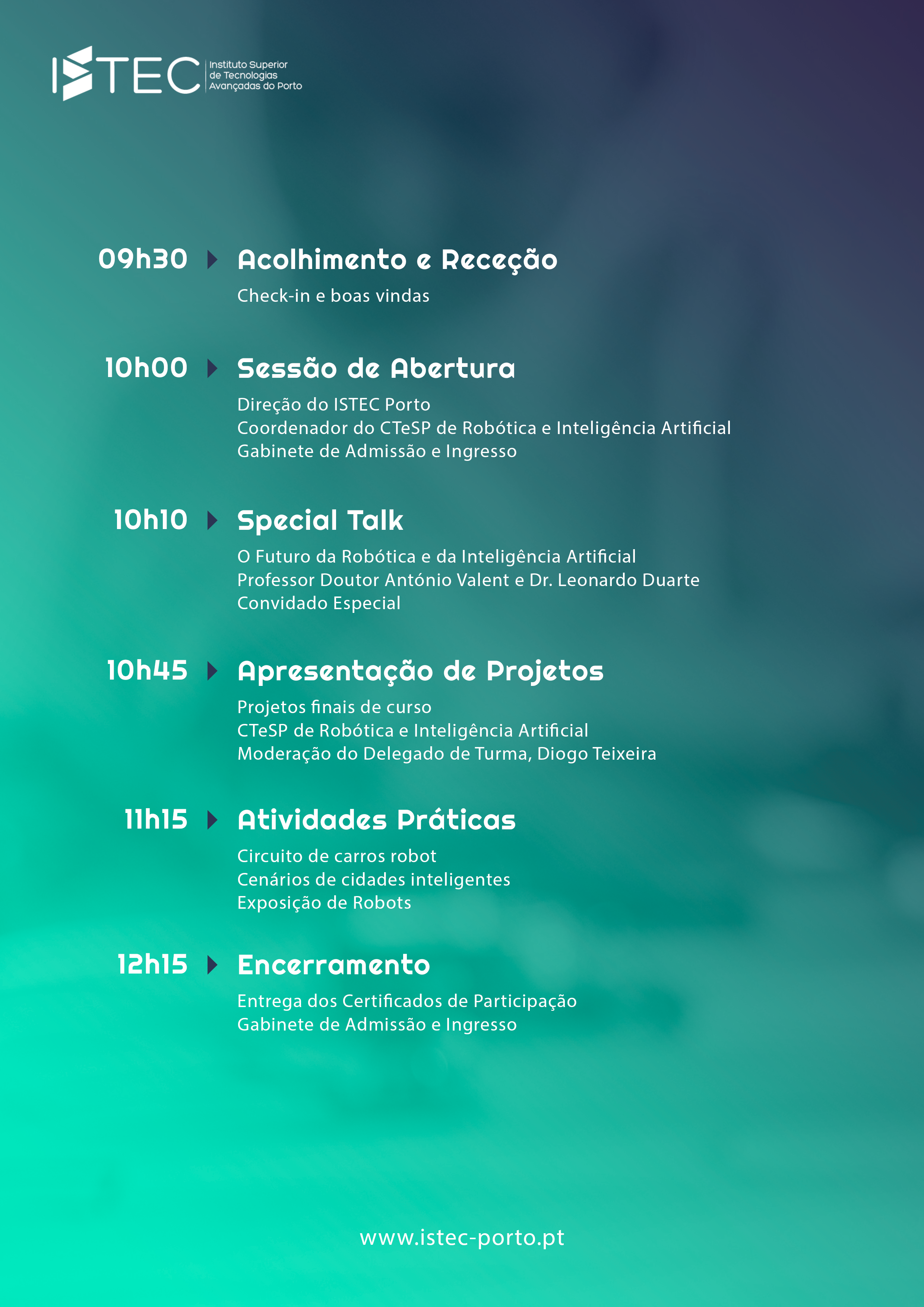 O programa inicia-se com o acolhimento e receção dos participantes, seguindo-se a Sessão de Abertura, com a presença da Direção do ISTEC Porto, do Coordenador do CTeSP de Robótica e Inteligência Artificial e do Gabinete de Admissão e Ingresso.
