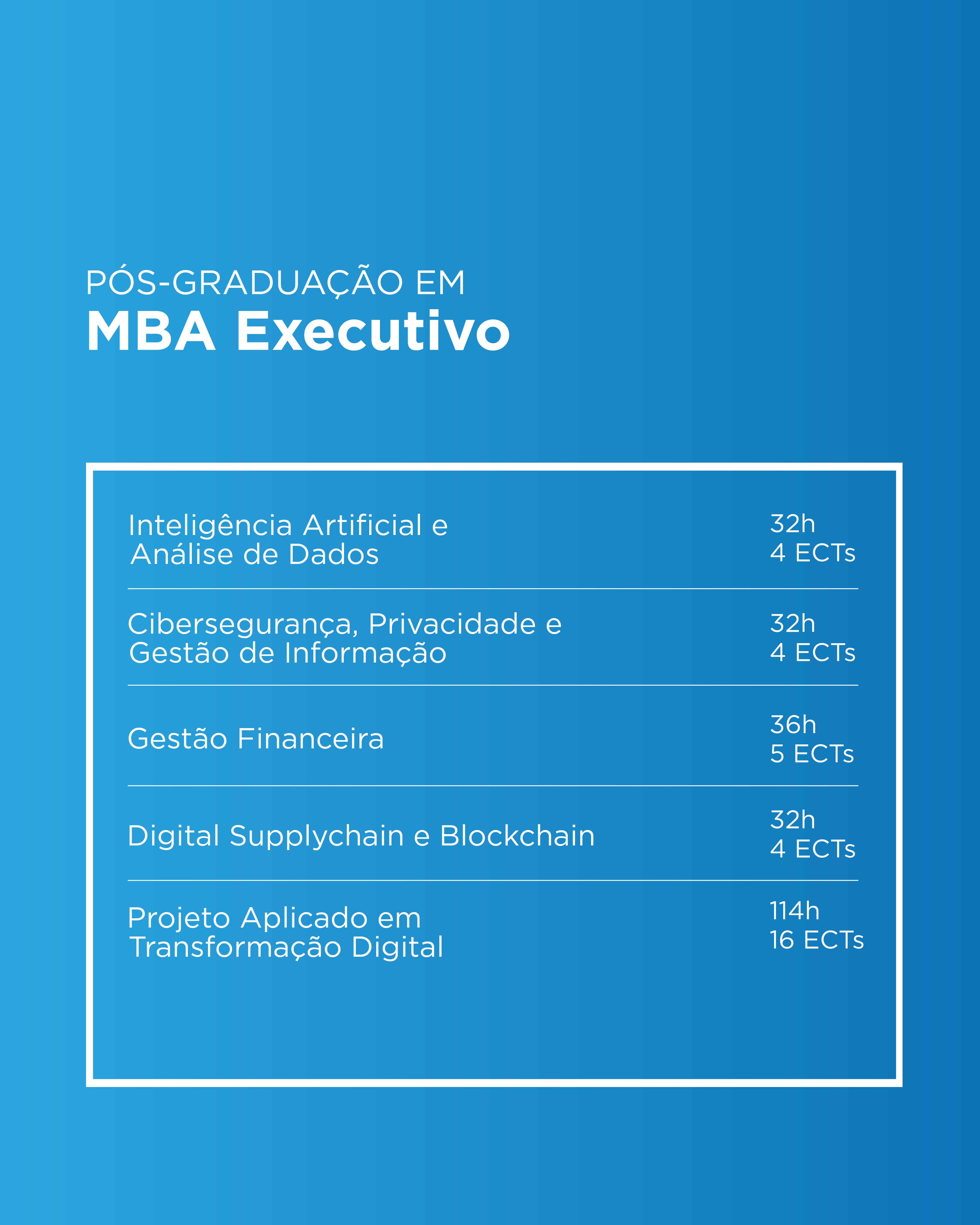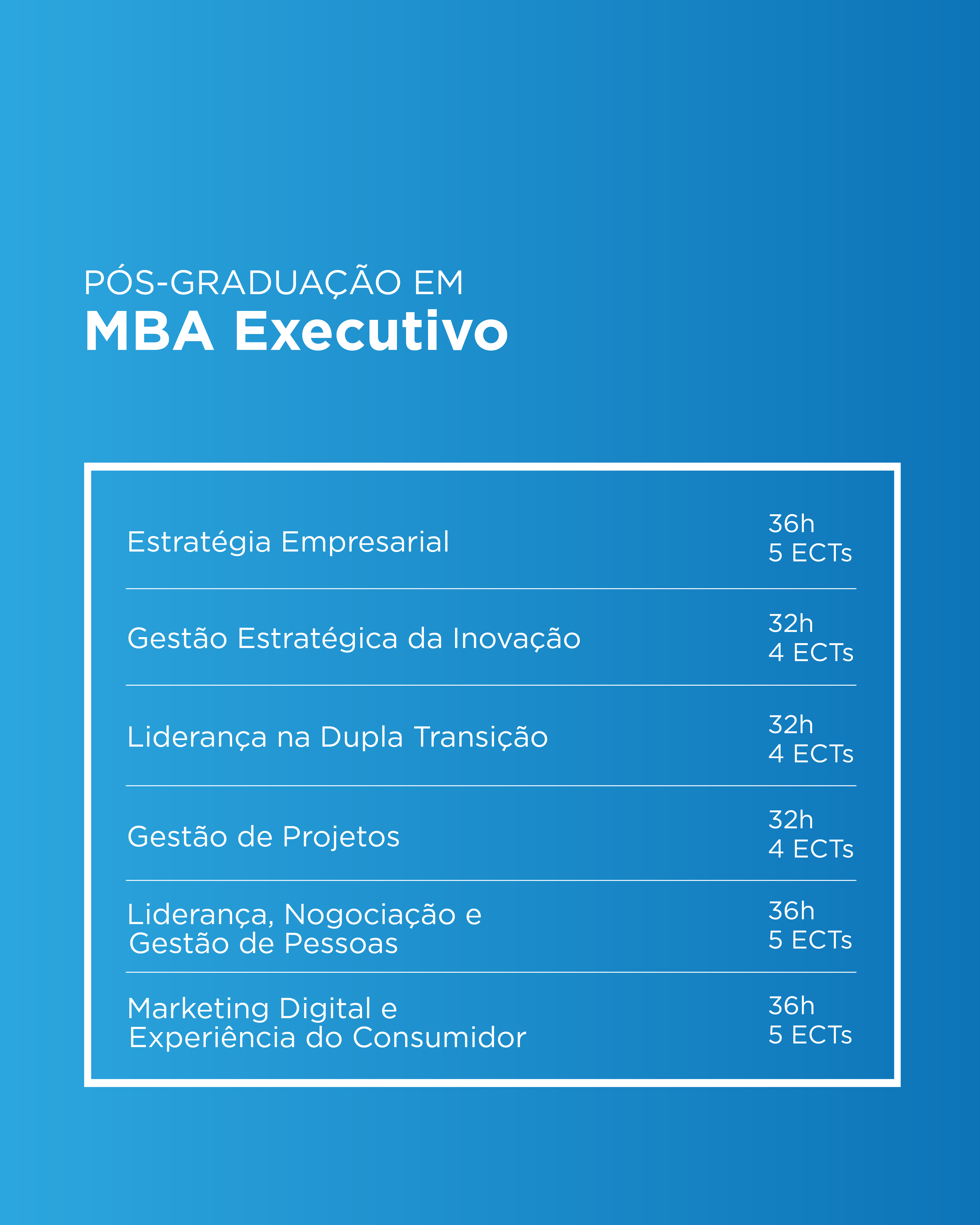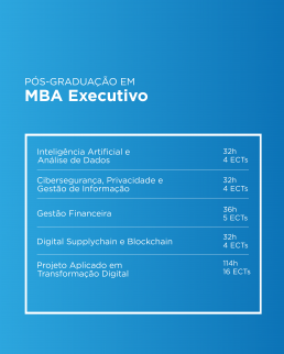 Prepare-se para liderar a próxima geração de negócios!O Executive MBA do ISTEC Porto capacita gestores e executivos para a era da disrupção digital.Com um currículo prático e atual, dominará estratégias avançadas em finanças, marketing e operações, e aprofundará conhecimentos em Inteligência Artificial, cibersegurança e gestão ágil.Desenvolva competências de liderança transformacional e gestão de equipas e torne-se um líder visionário, ágil e tecnologicamente proficiente, apto para cargos de topo como Diretor de Transformação Digital ou Diretor de Inovação.Moldar o futuro do negócio começa aqui.