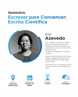 Destinado a apoiar a elaboração de relatórios, artigos e dissertações, este seminário aborda as boas práticas da escrita científica — revisão da litetarura, metodologia, discussão de resultados, conclusões e referências. Foca-se na clareza, rigor e coerência como ferramentas para comunicar conhecimento de forma credível e acessível.