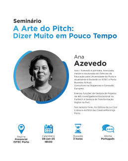 Um pitch eficaz combina clareza, estrutura e emoção. Este seminário ensina a apresentar ideias, projetos ou percursos pessoais de forma convincente, em pouco tempo e com impacto. Os participantes aprendem a construir e aperfeiçoar o seu próprio pitch com base em exemplos e feedback.